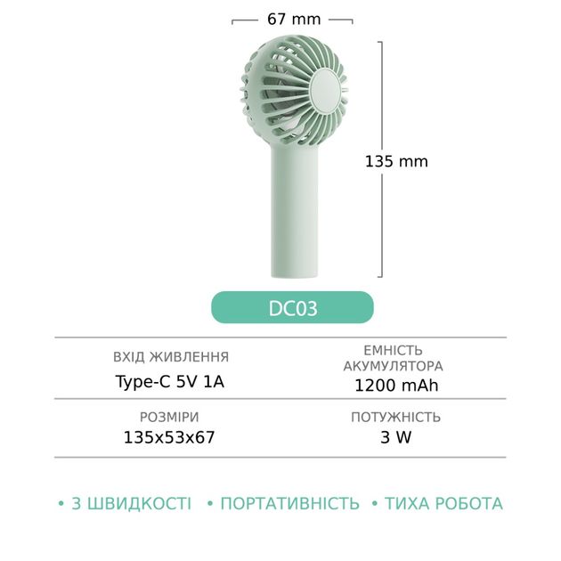 - Компактність та зручність: З розмірами всього 135х53х67 мм, вентилятор легко поміщається у сумку або рюкзак, що робить його ідеальним для використання вдома, в офісі або на прогулянці.
