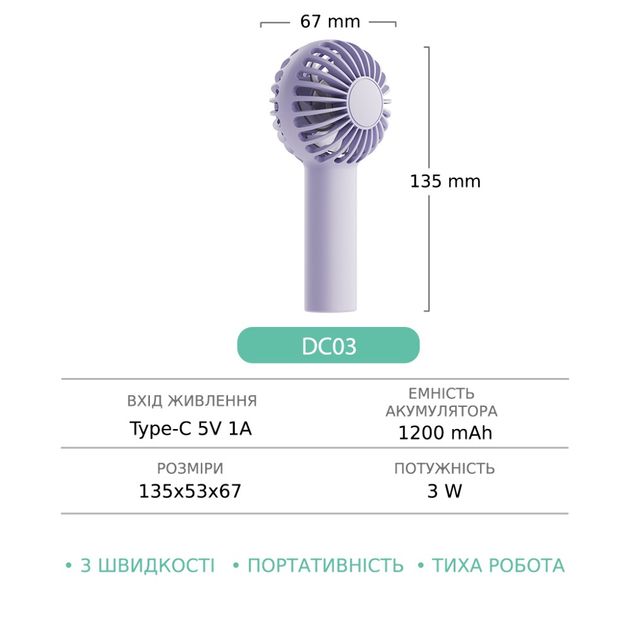 - Компактність та зручність: З розмірами всього 135х53х67 мм, вентилятор легко поміщається у сумку або рюкзак, що робить його ідеальним для використання вдома, в офісі або на прогулянці.
