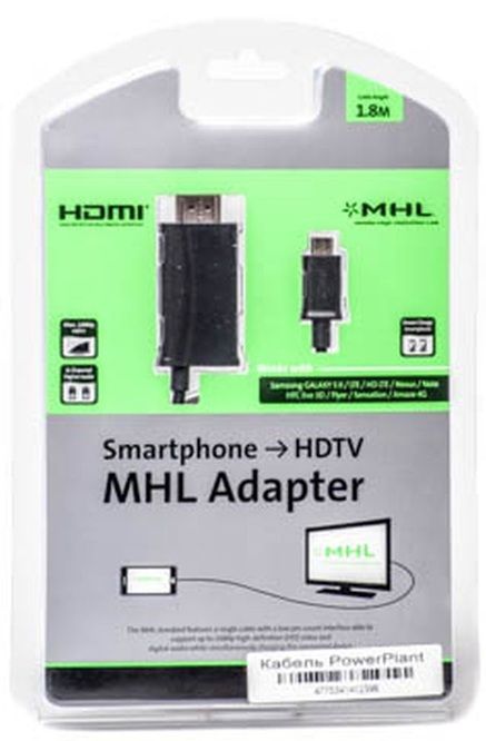 Кабель PowerPlant micro USB-HDMI (MHL) дозволяє підключити смартфон або планшет до телевізора, монітора або проектора з HDMI-входом для перегляду фото та відео у Full HD 1080p. Він підтримує передачу об'ємного звуку, а також одночасне заряджання пристрою під час роботи.