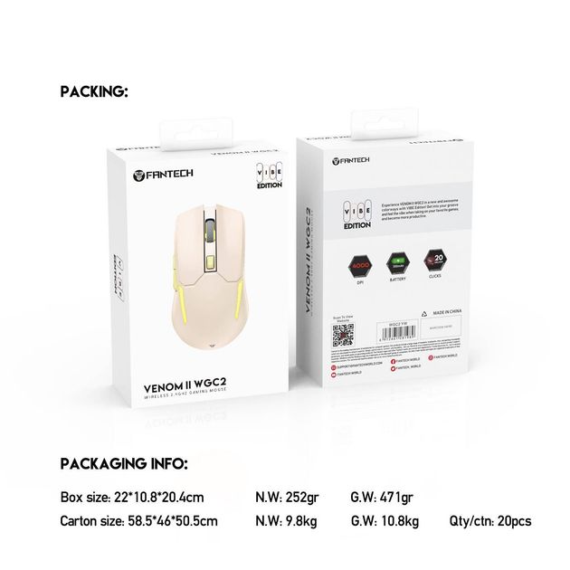 Ігрова Wireless миша Fantech WGC2 Venom II Vibe, RGB, 800-4000DPI, 2.4GHz, 300mAh, 720h, бежевий
