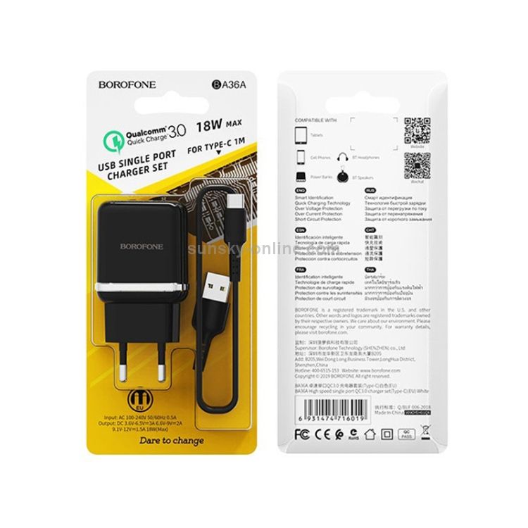 Мережевий зарядний пристрій Borofone BA36A з кабелем USB to Type-C, підтримка QC3.0, чорний колір