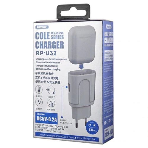 Зарядний пристрій Remax RP-U32 Cole Series 2in1 1USB 2.1A + 8pin зарядний порт для AirPods 0.2A white